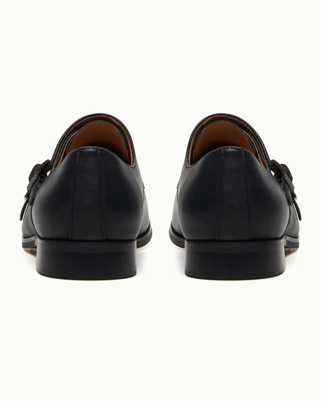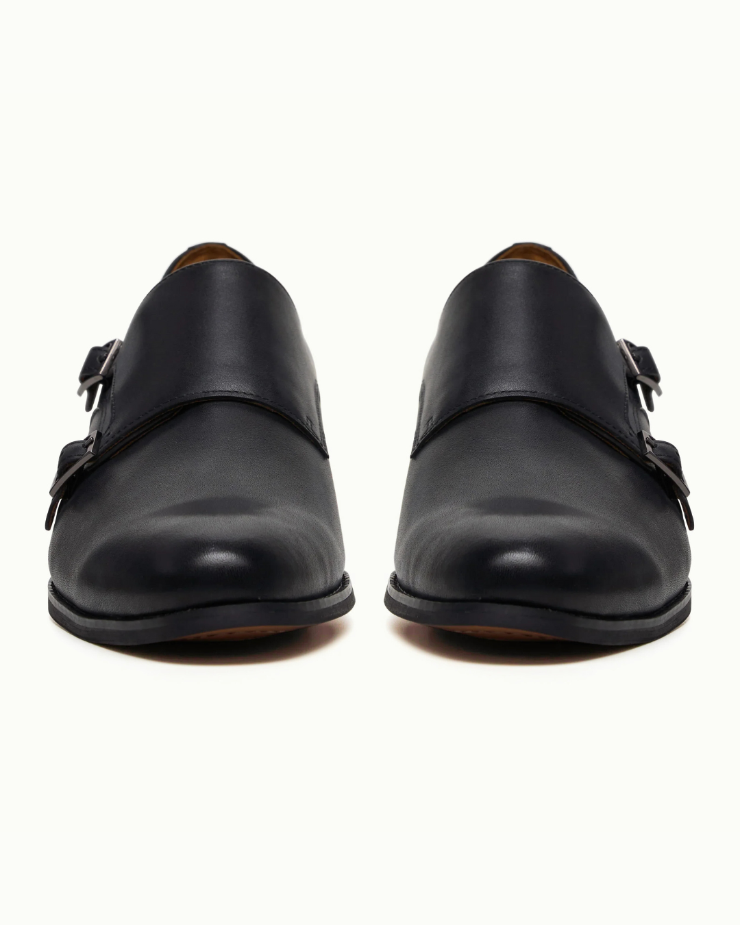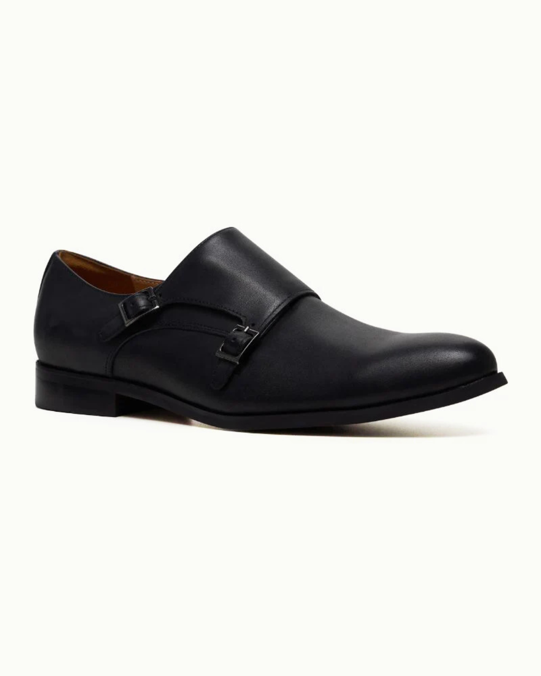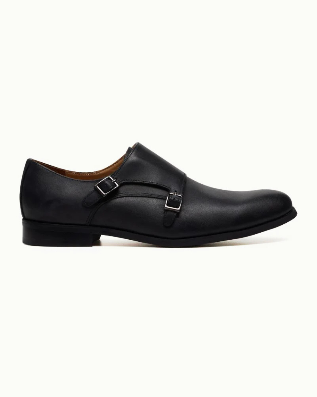Elevate your style with our Double Monk Shoe in Black Leather, featuring sleek, silver-toned buckles and a refined design. Crafted from premium black leather with a smooth finish, these shoes combine sophistication with a modern twist, perfect for both office wear and formal occasions.