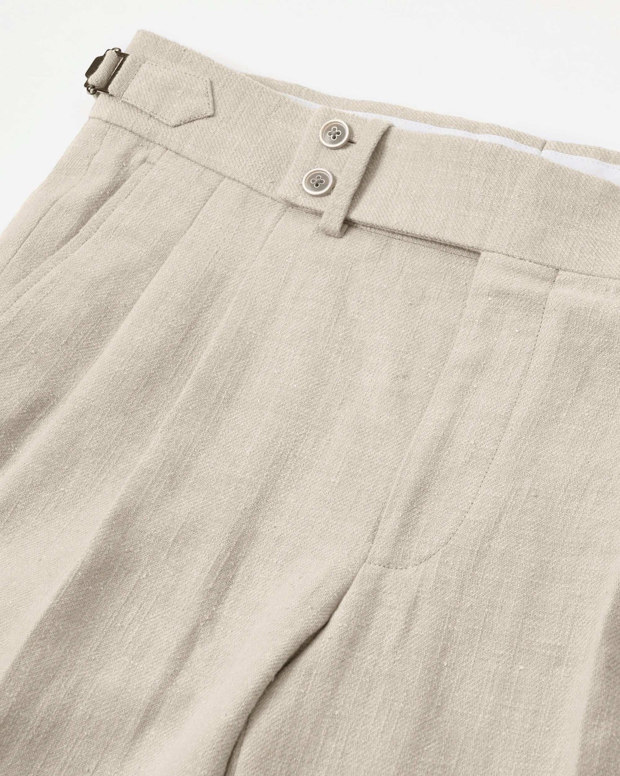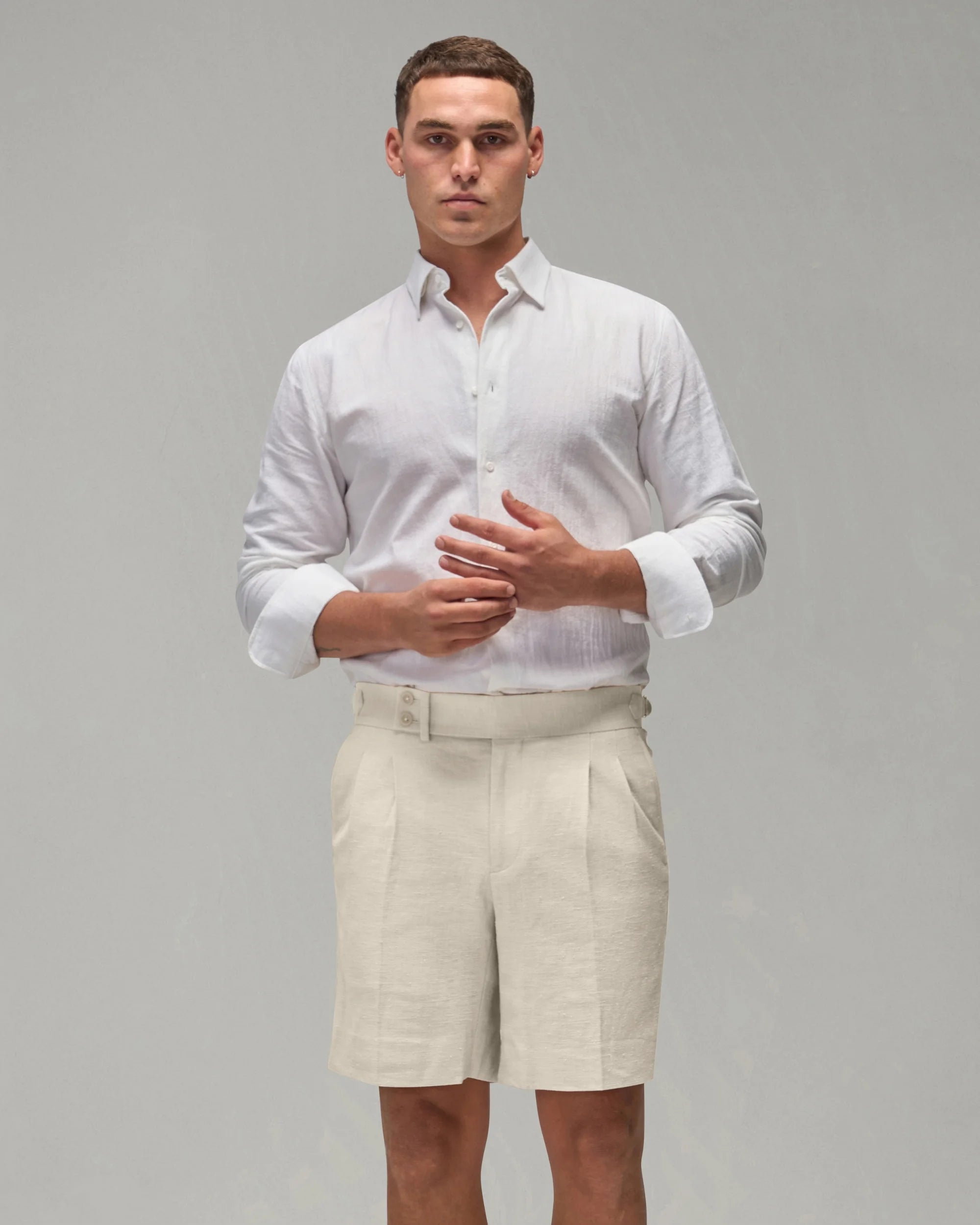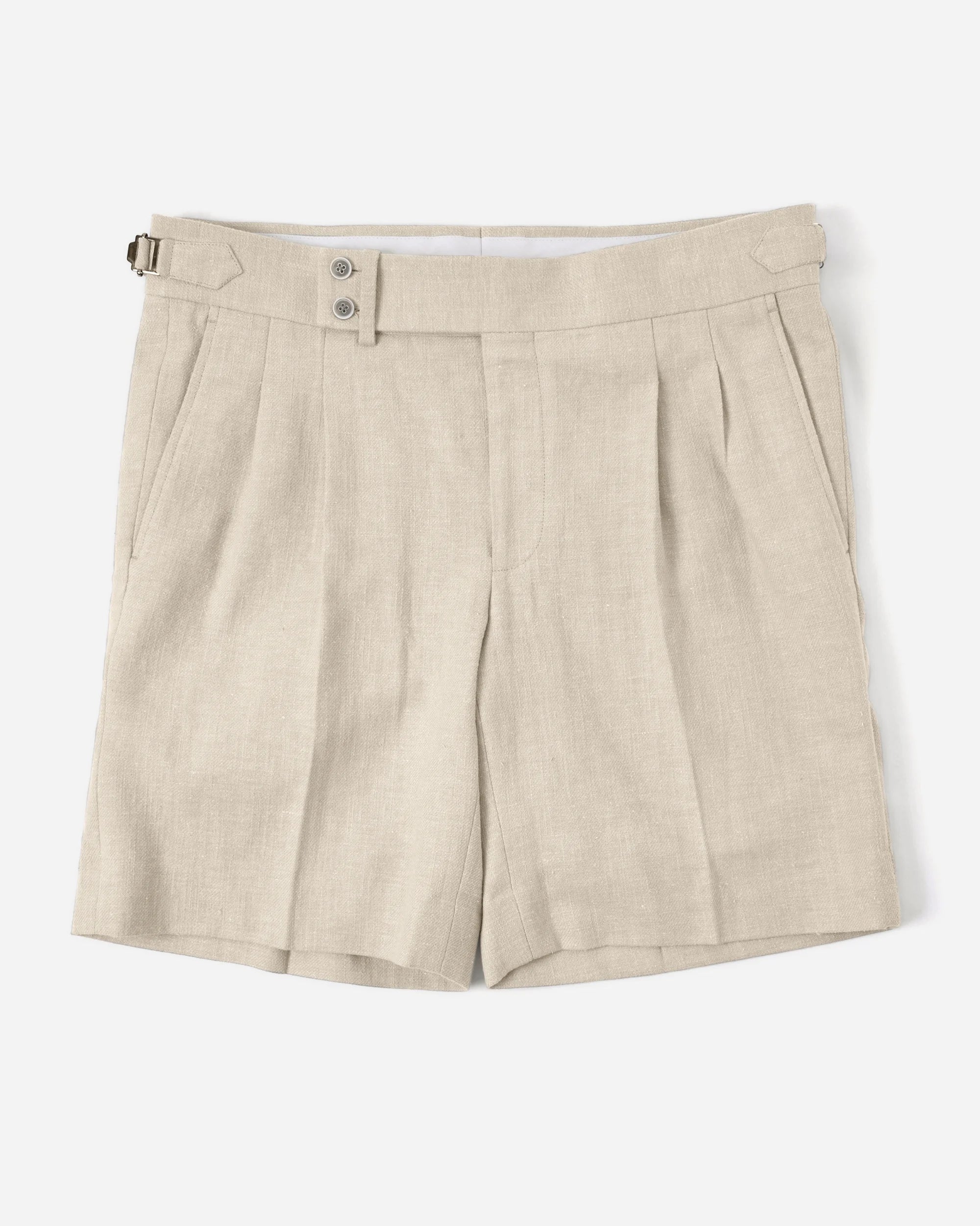 Crafted from sumptuously soft fabric, these shorts in Oatmeal offer a refined yet relaxed appeal. With their tailored silhouette and double pleats, they echo the sartorial elegance whilst offering a more casual aesthetic.