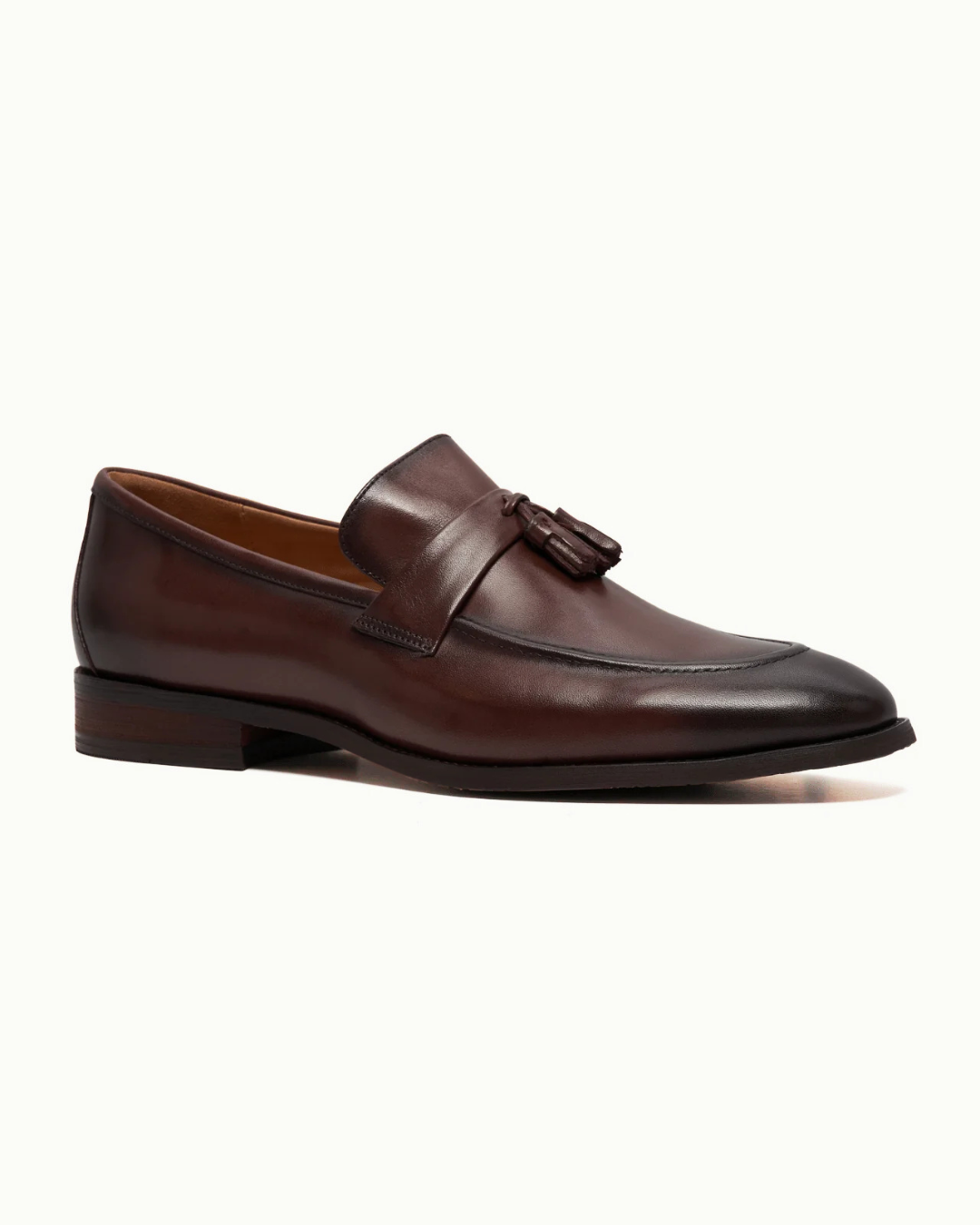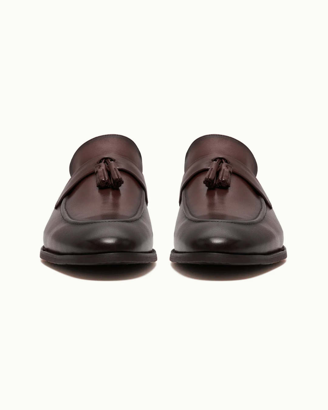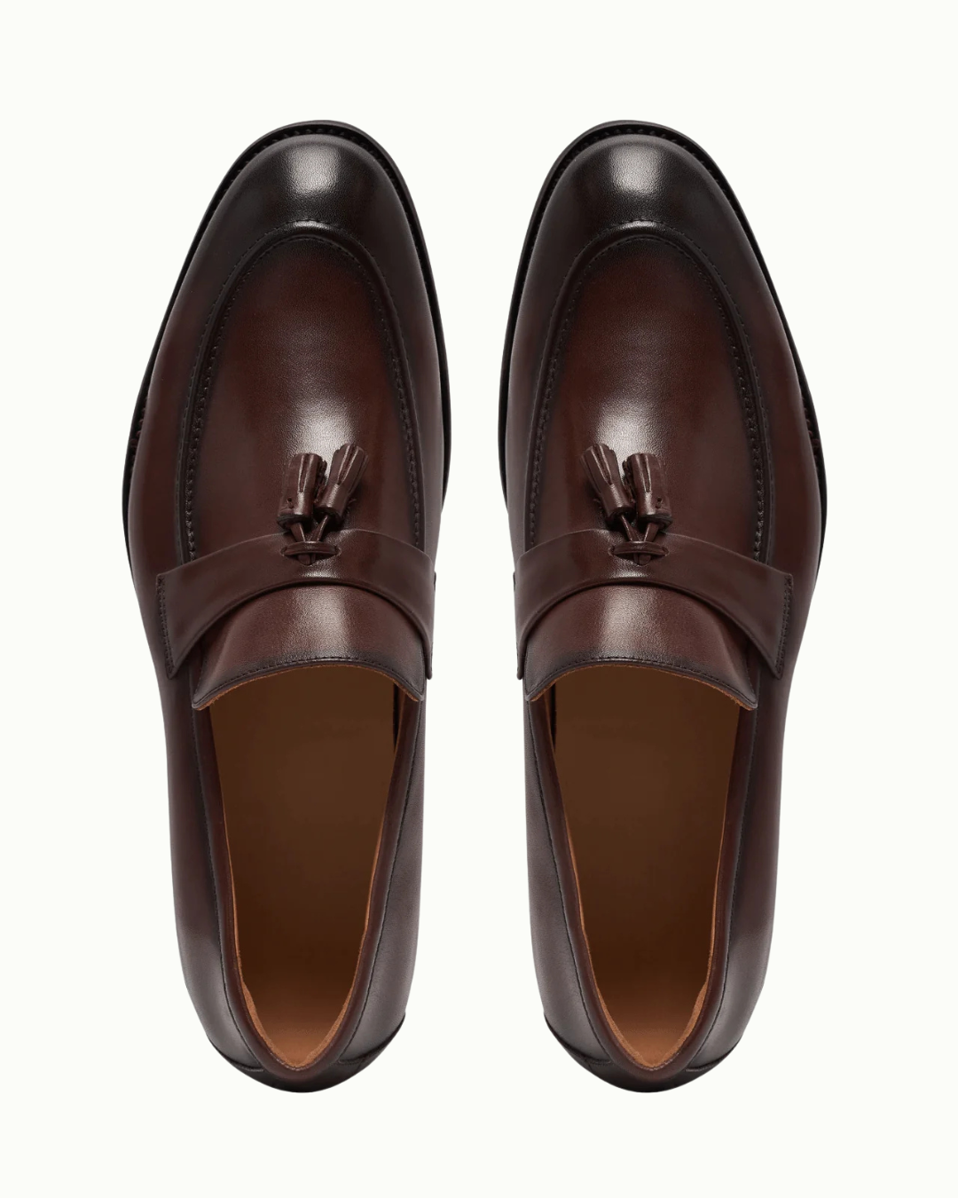 Tasseled almond-toe loafers with top band, crafted in premium brown leather and fully lined.