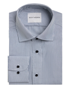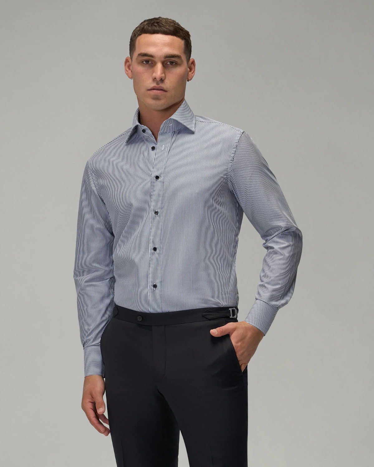Bring a sleek edge to your professional wardrobe with the Mr Ford Shirt in Black Mid Stripe. The fine stripe pattern adds a classic sophistication to the shirt.