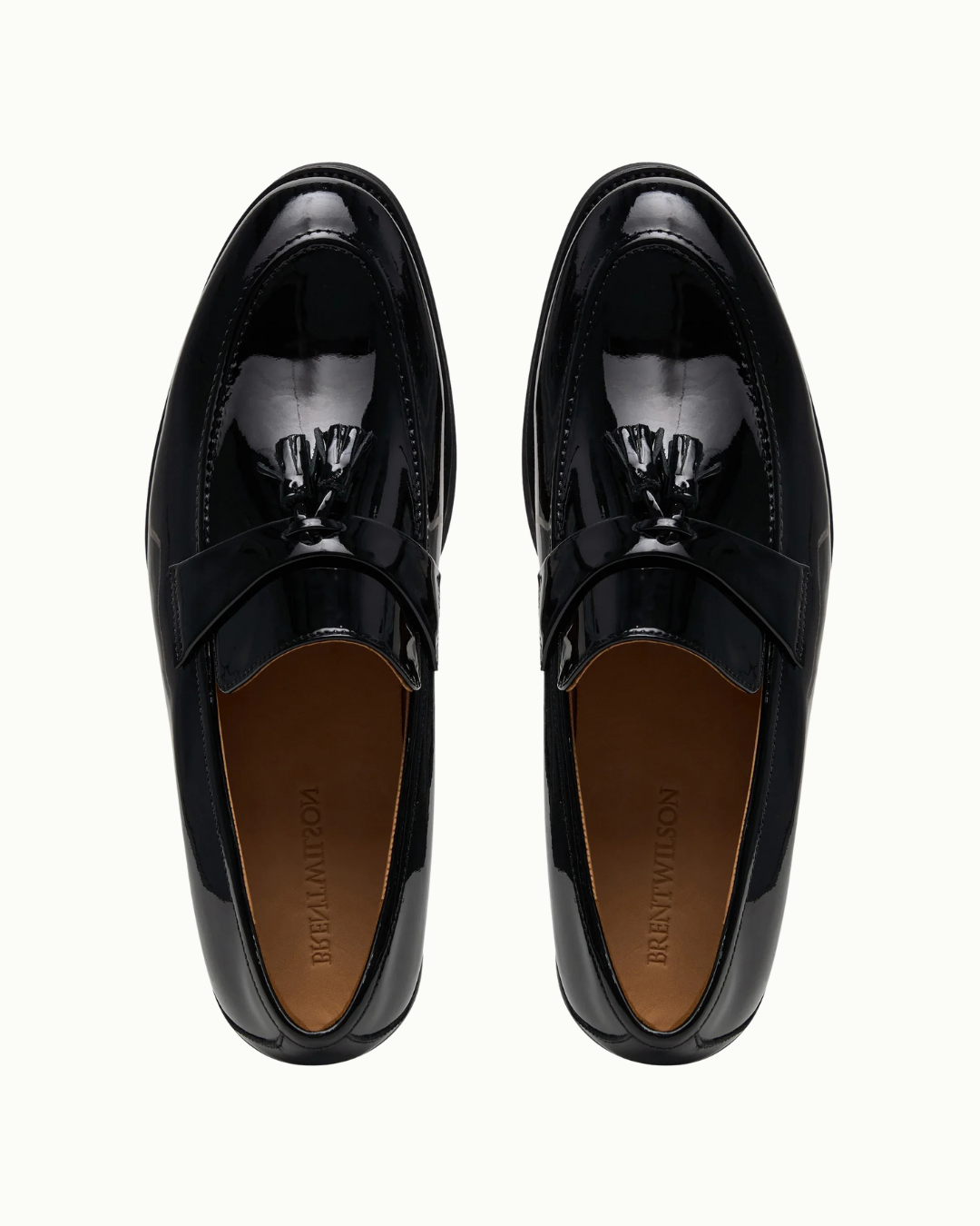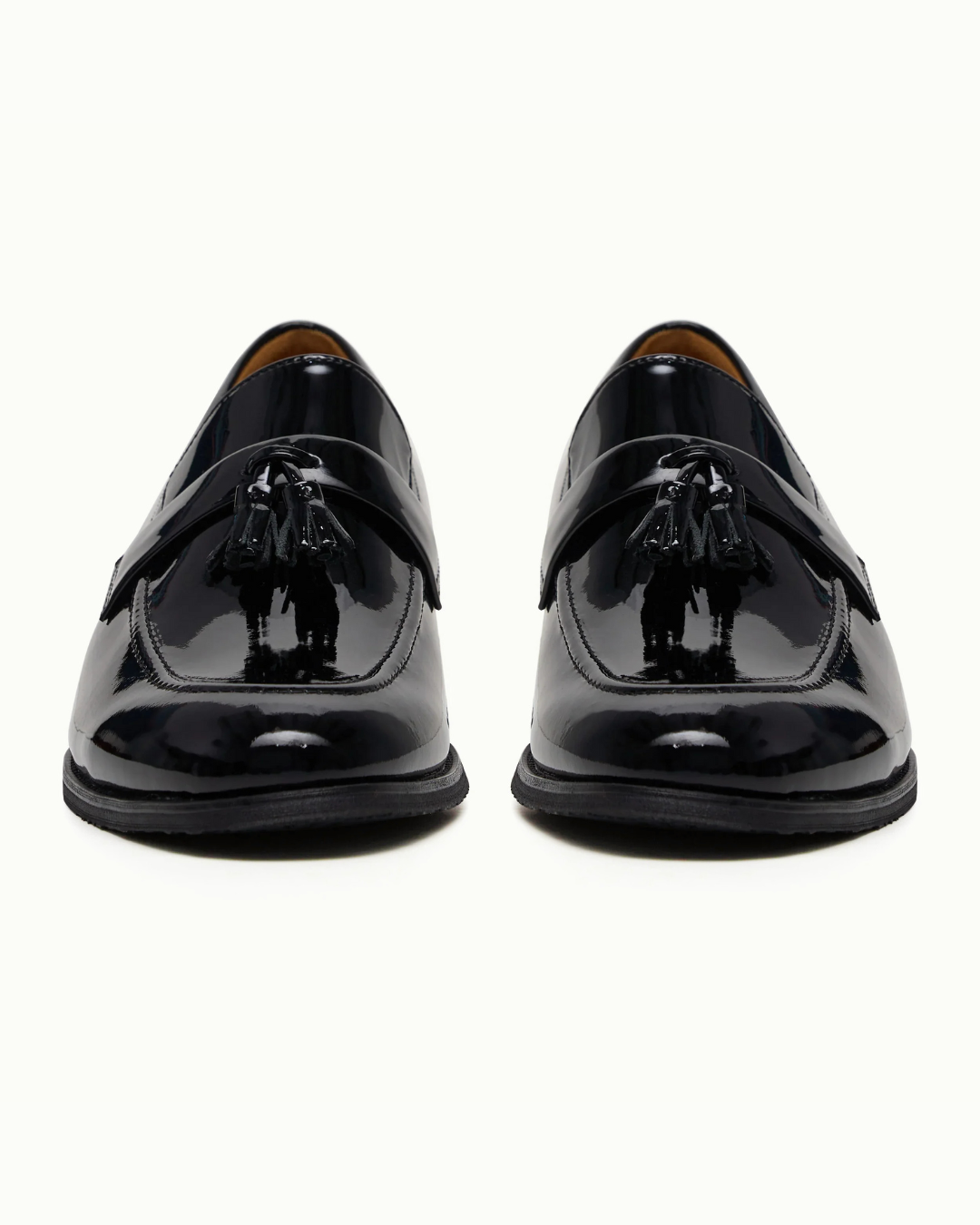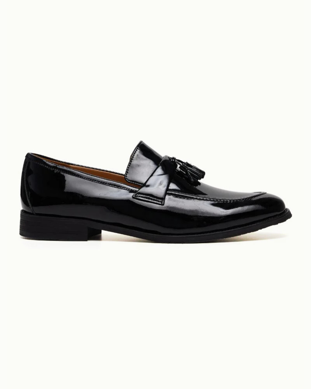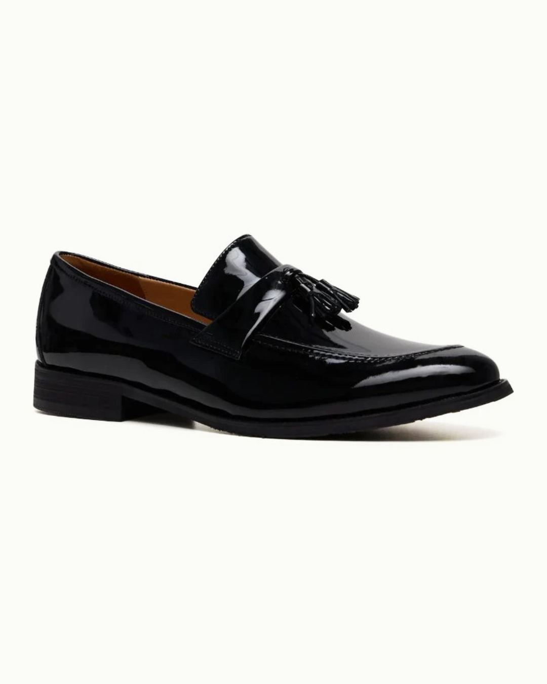 Step into sophistication with our Tasseled Loafer in Black Patent Leather. This striking shoe features a gleaming patent leather upper with elegant tassels, making it a standout choice for evening wear or special occasions where style is paramount.