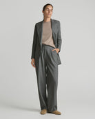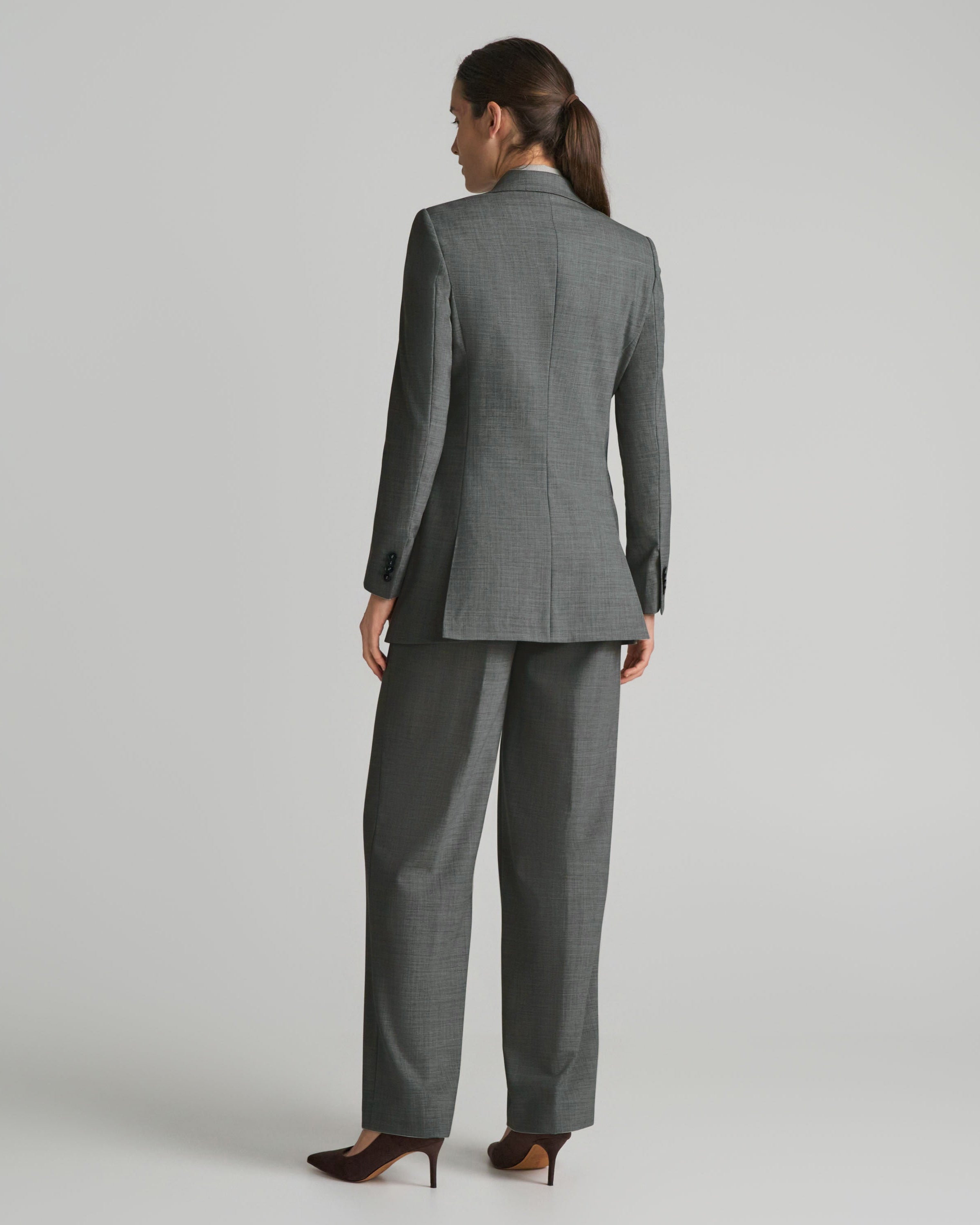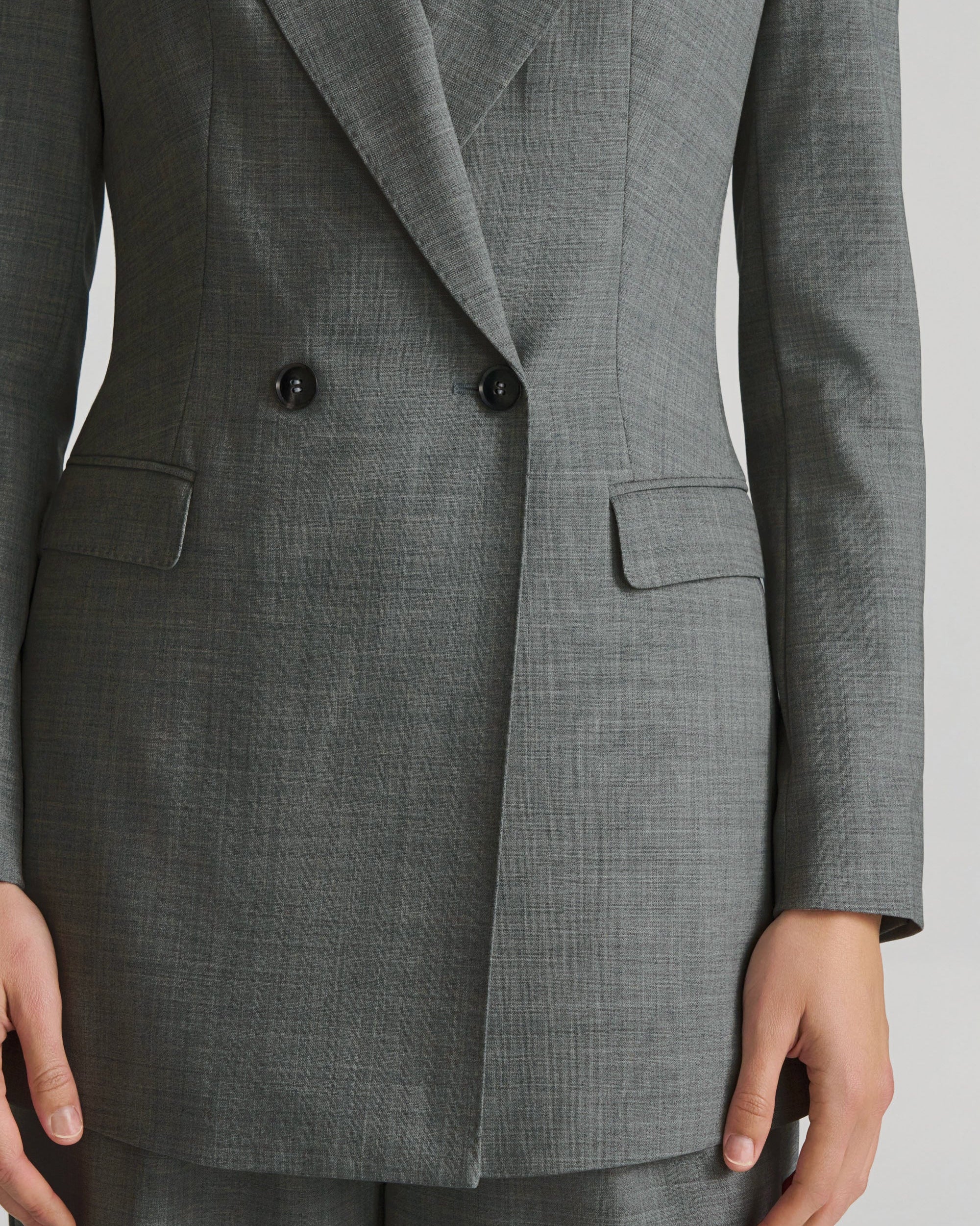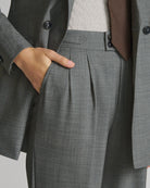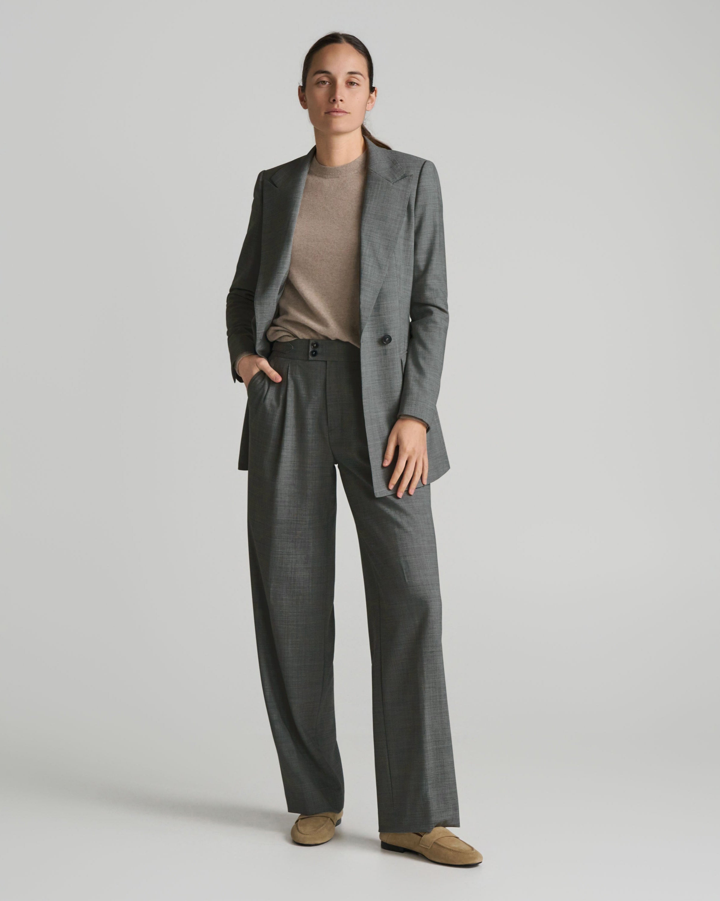The jacket delivers sharp structure and is available as a double-breasted peak lapel blazer or a single-breasted blazer. It is designed to pair with matching tailored trousers, which feature front pleats and a relaxed, generous cut for added depth and a more traditional silhouette. Together, the blazer and trousers create a polished look that works across different occasions while exuding confidence and refinement.