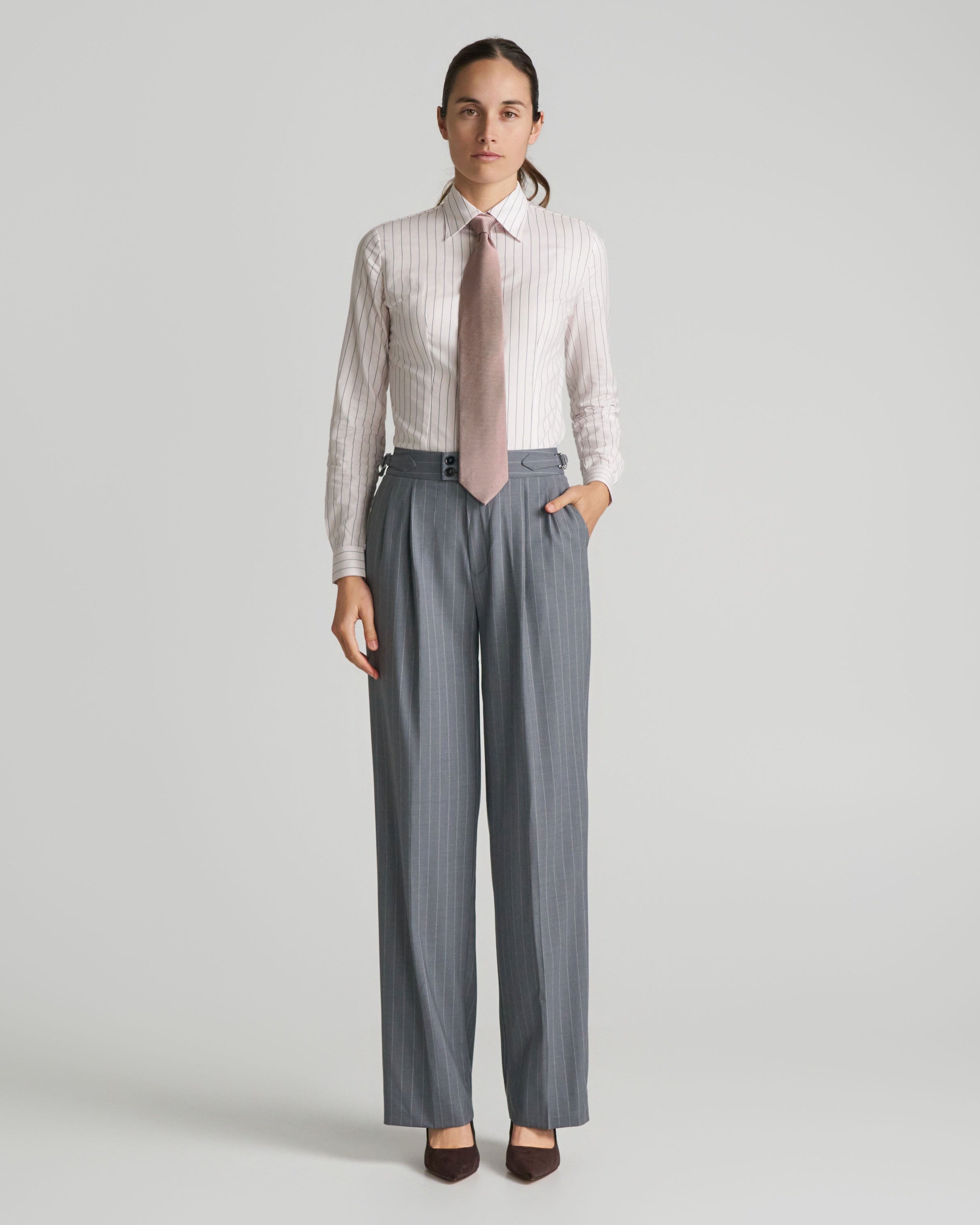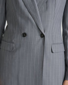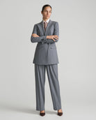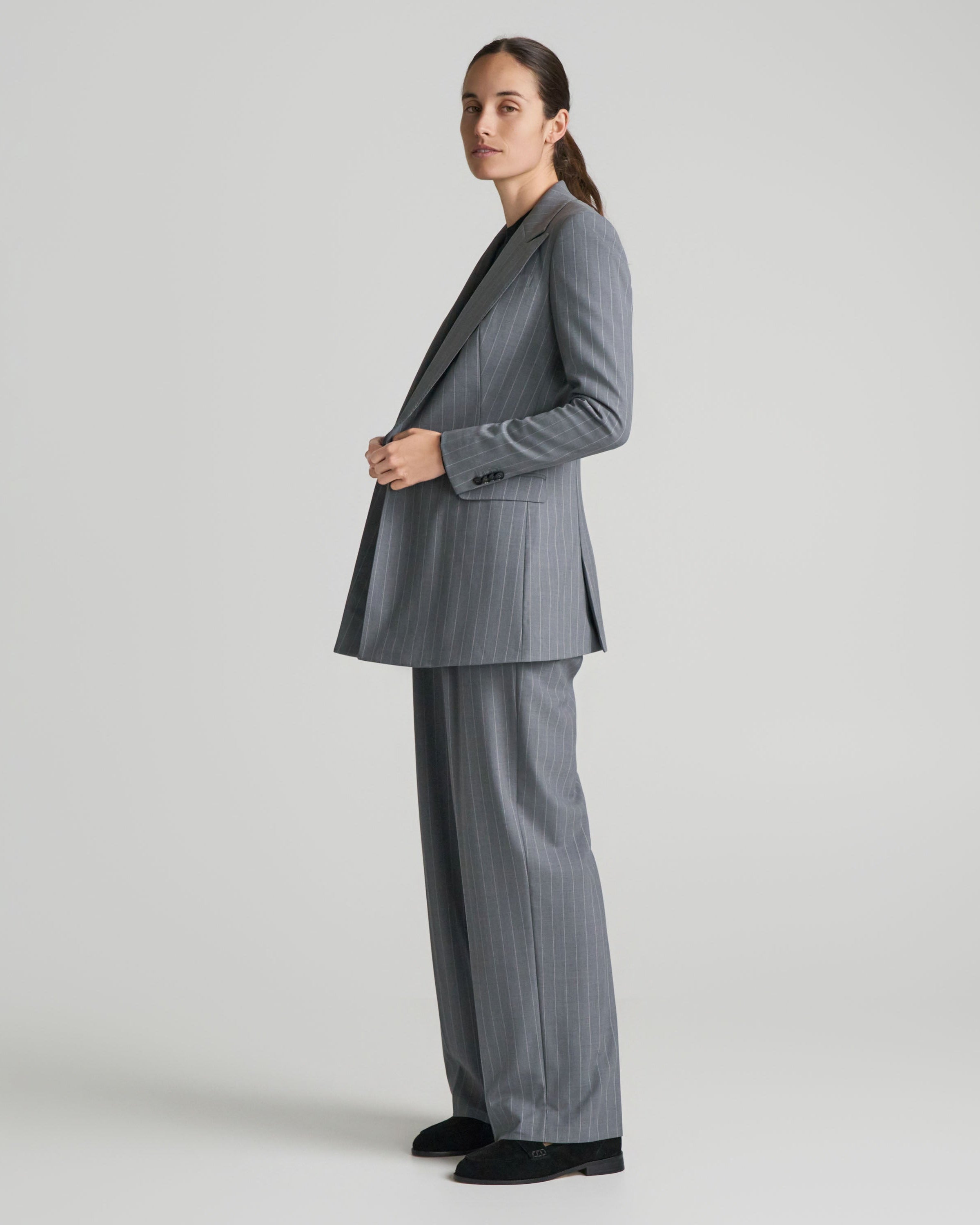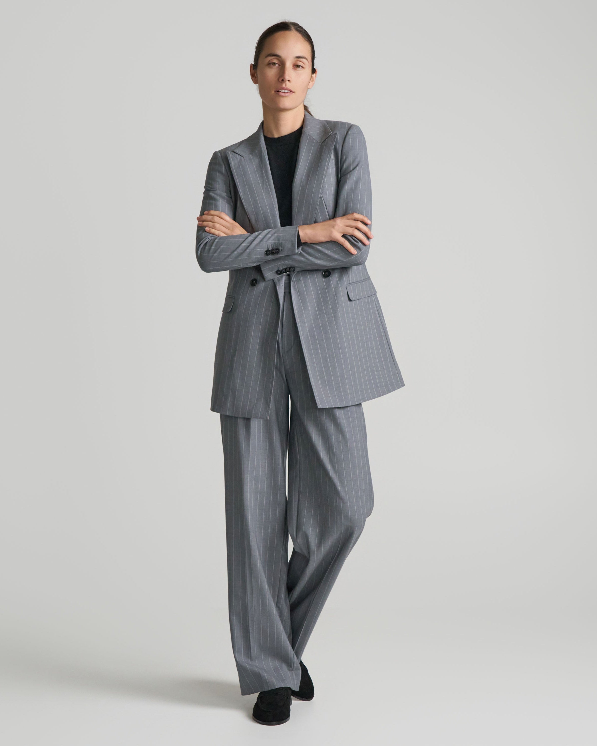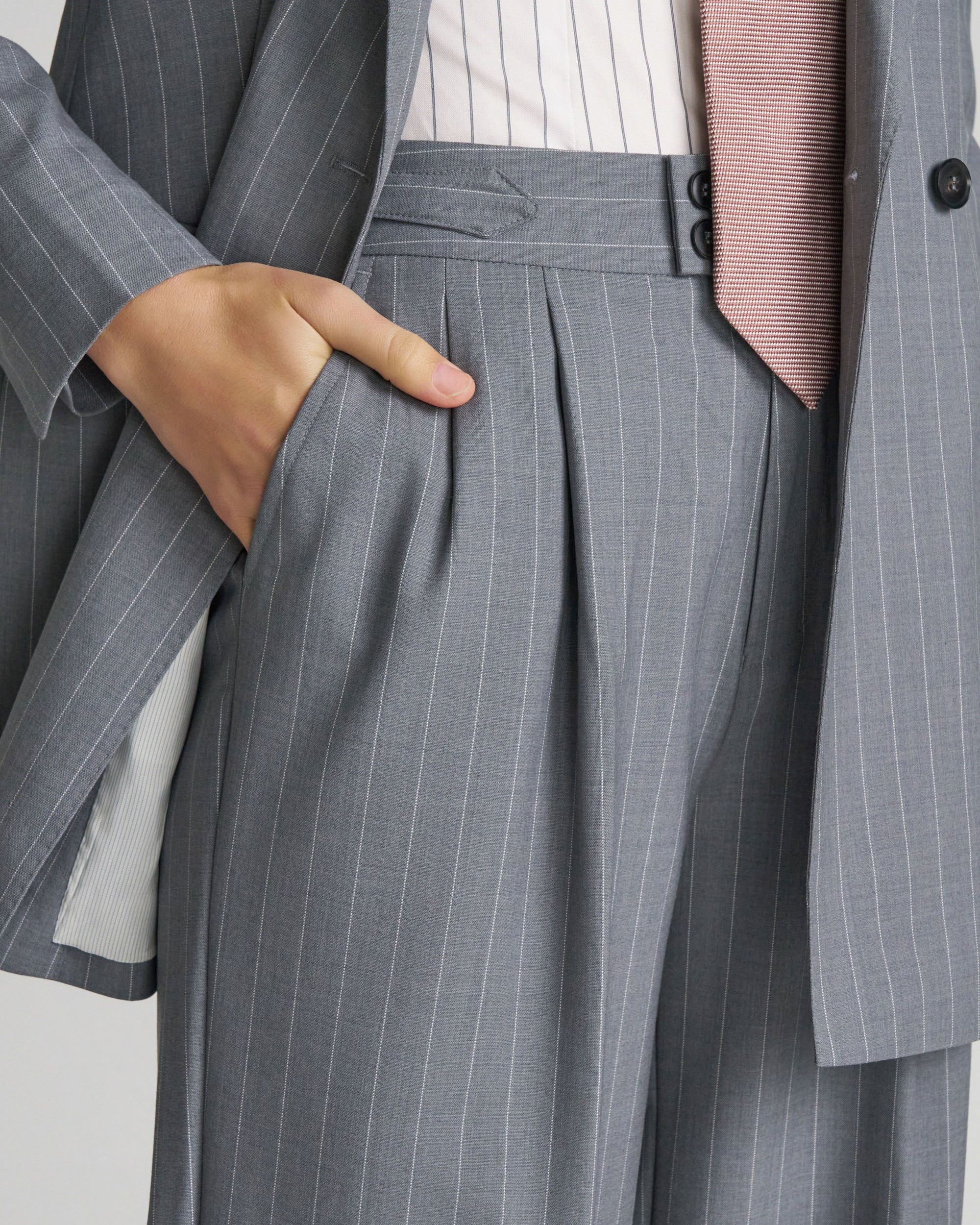 The jacket delivers sharp structure and is available as a double-breasted peak lapel blazer or a single-breasted blazer. It is designed to pair with matching tailored trousers, which feature front pleats and a relaxed, generous cut for added depth and a more traditional silhouette. Together, the blazer and trousers create a polished look that works across different occasions while exuding confidence and refinement.