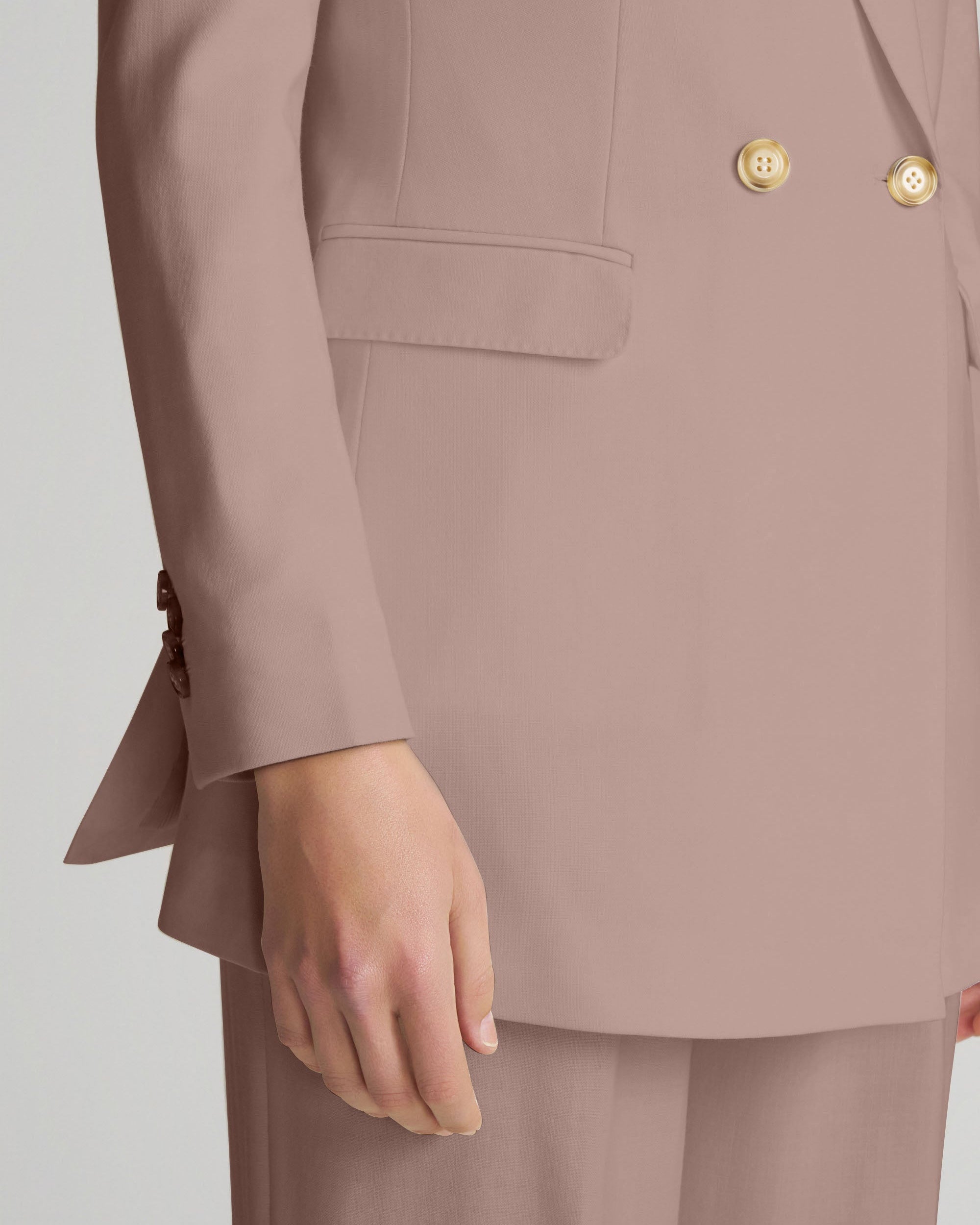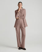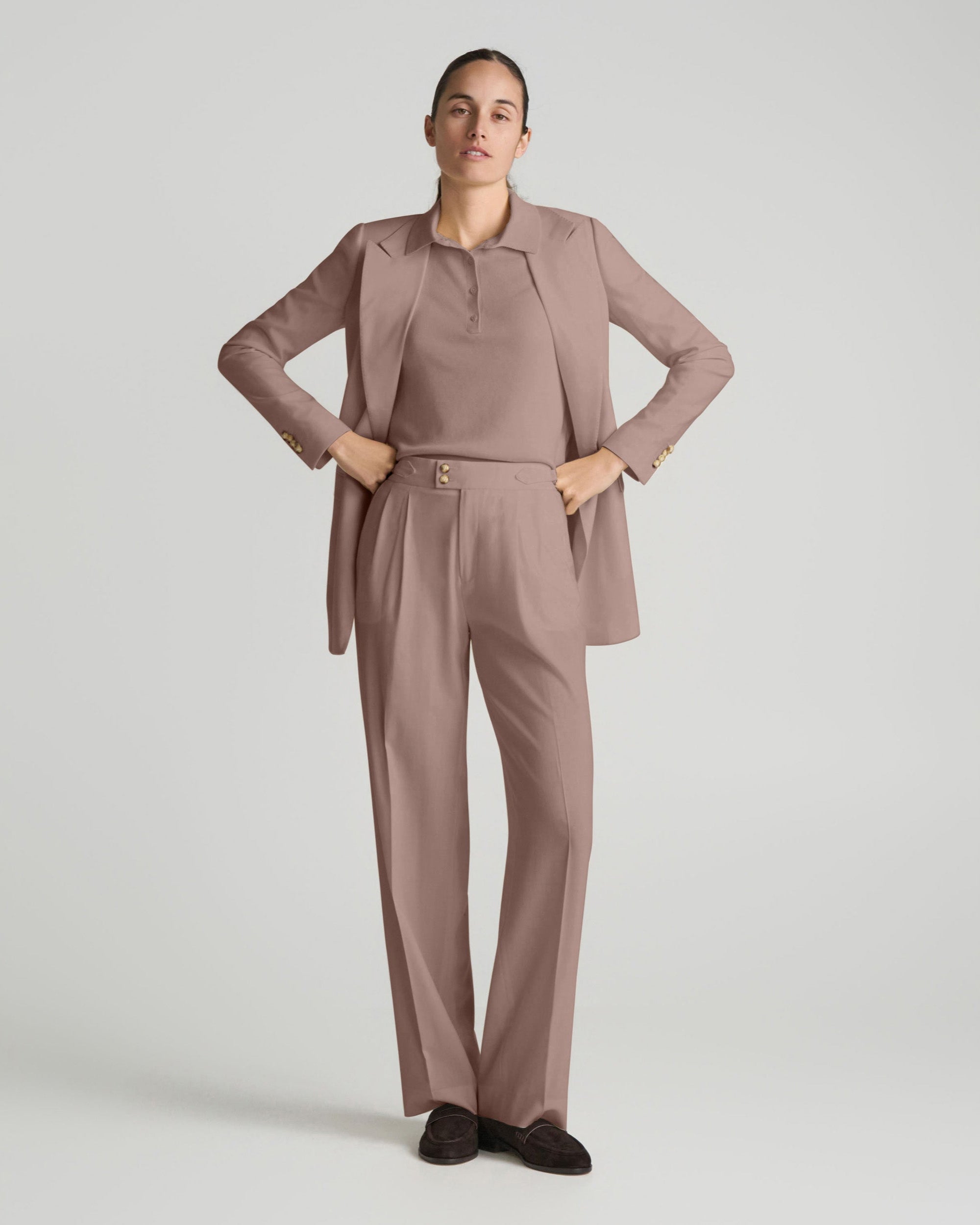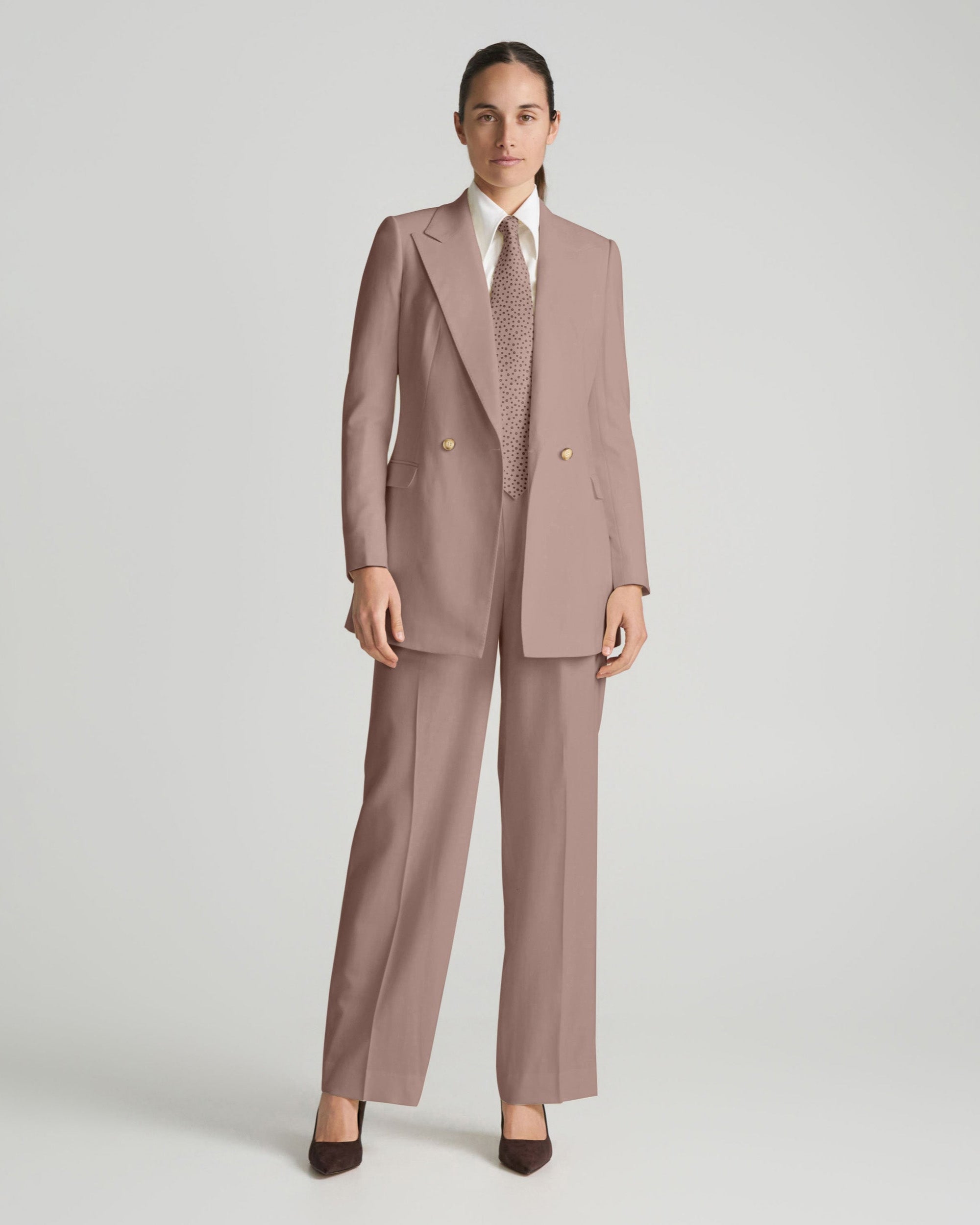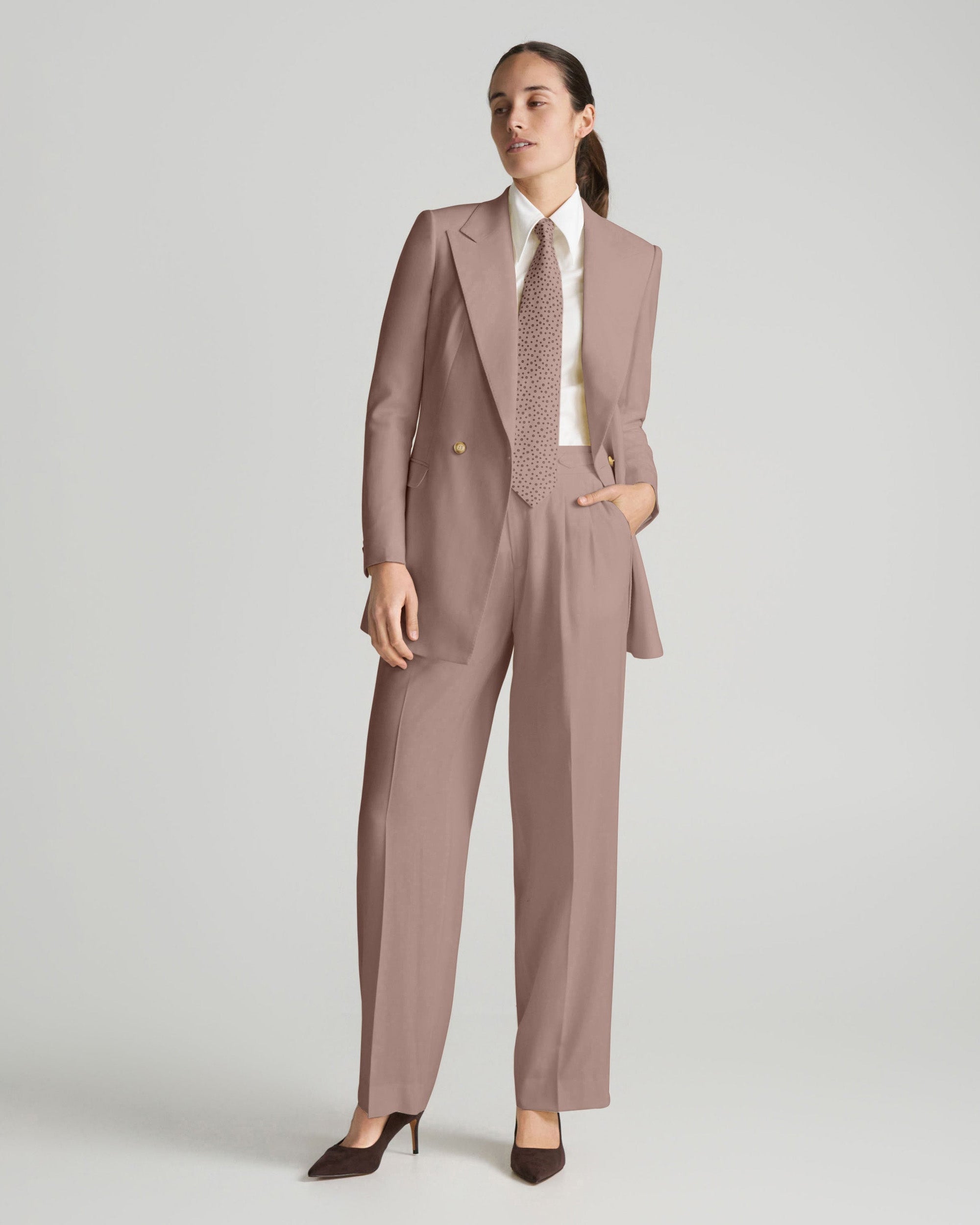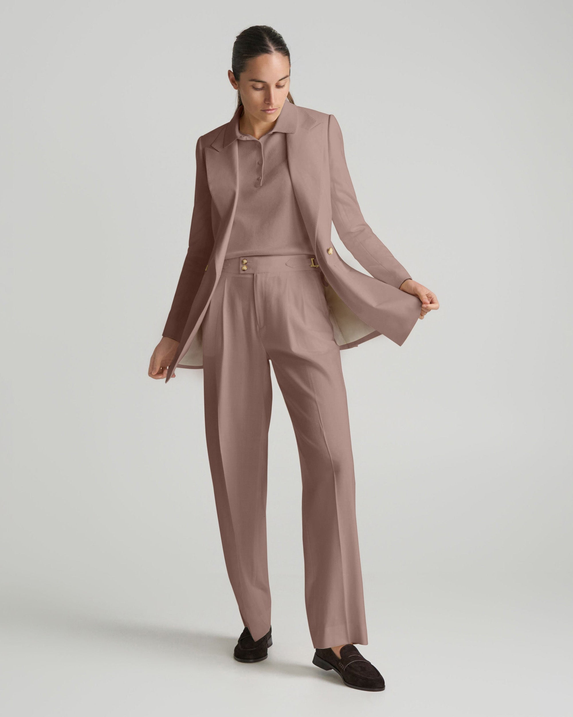 The jacket delivers sharp structure and is available as a double-breasted peak lapel blazer or a single-breasted blazer. It is designed to pair with matching tailored trousers, which feature front pleats and a relaxed, generous cut for added depth and a more traditional silhouette. Together, the blazer and trousers create a polished look that works across different occasions while exuding confidence and refinement.