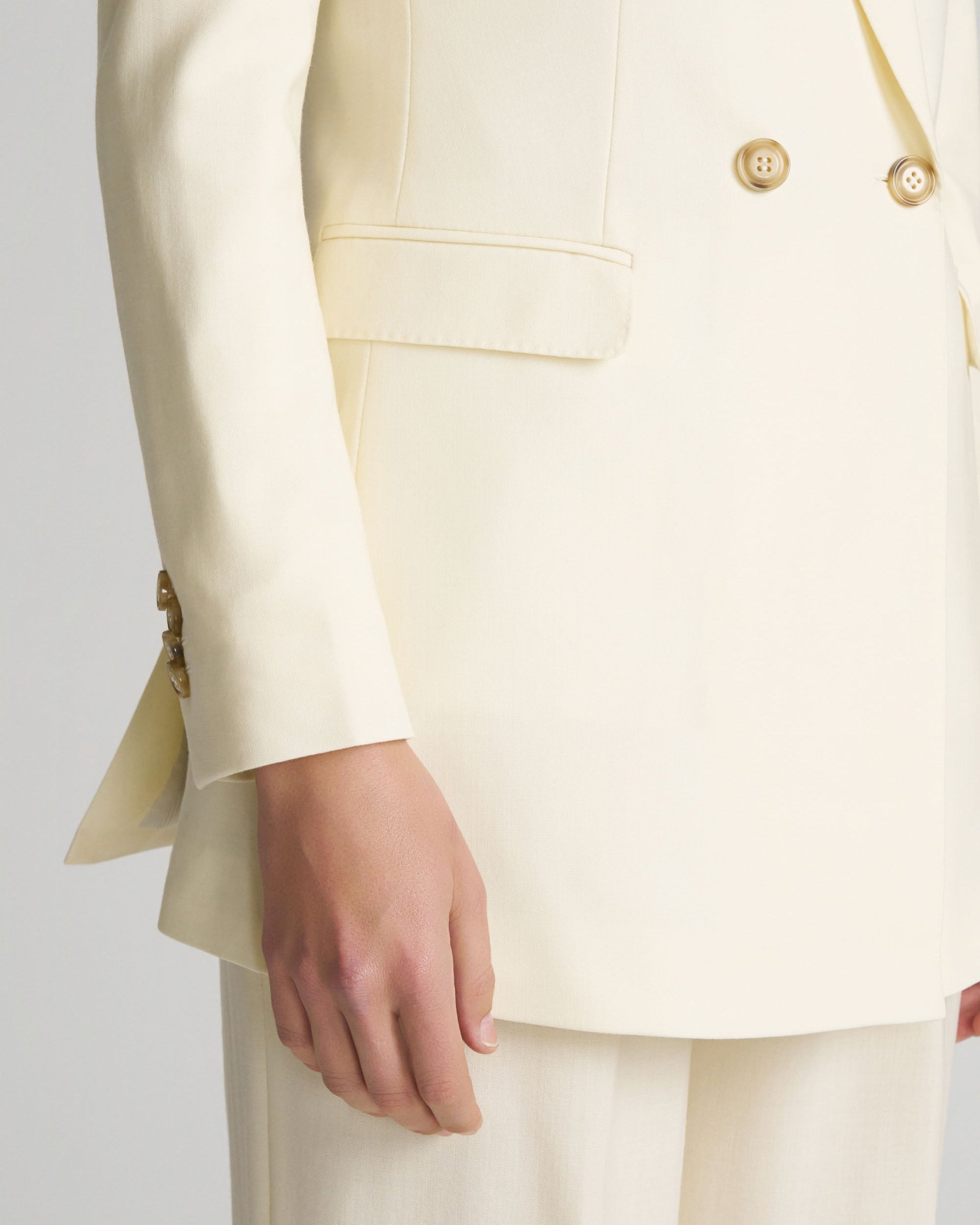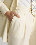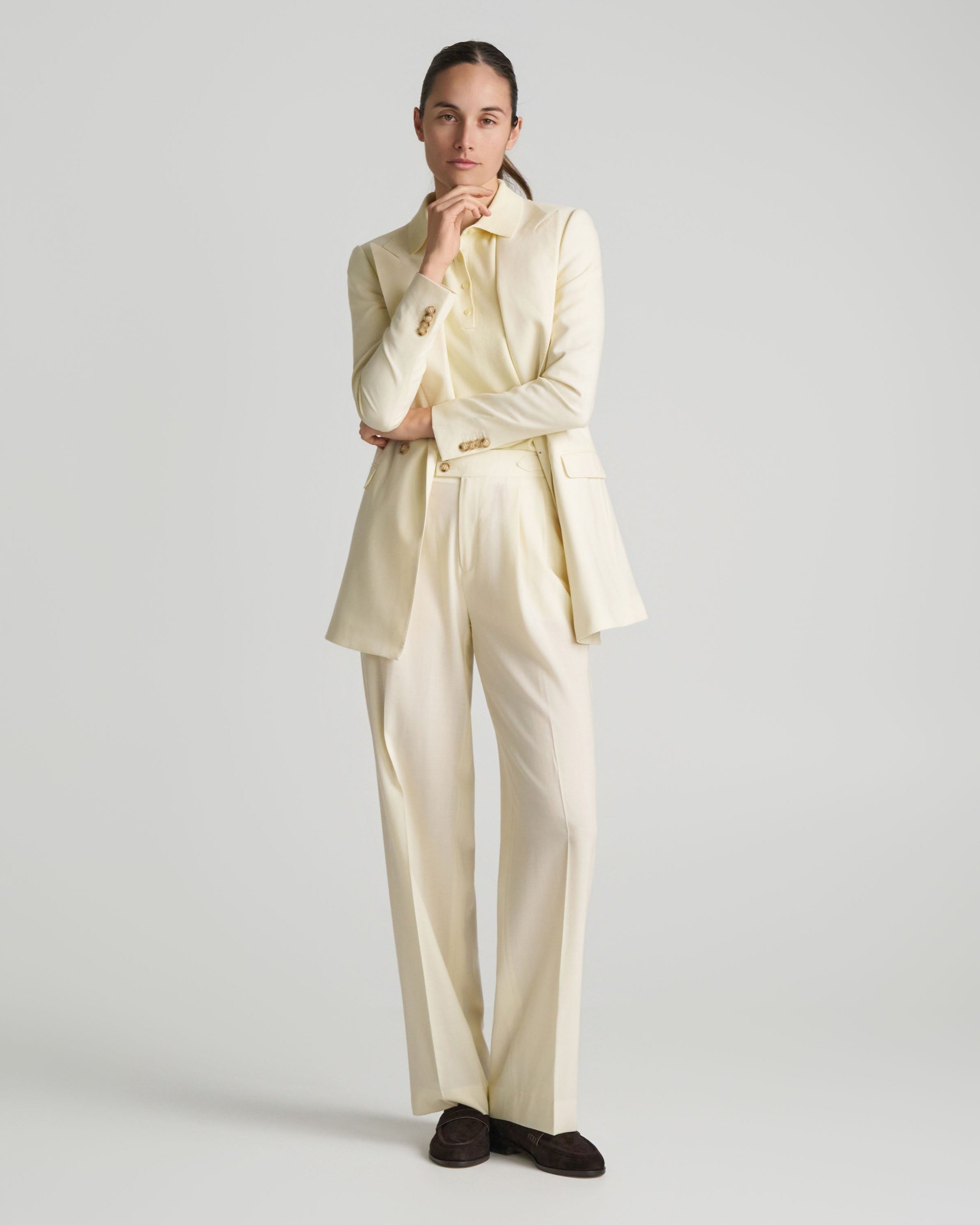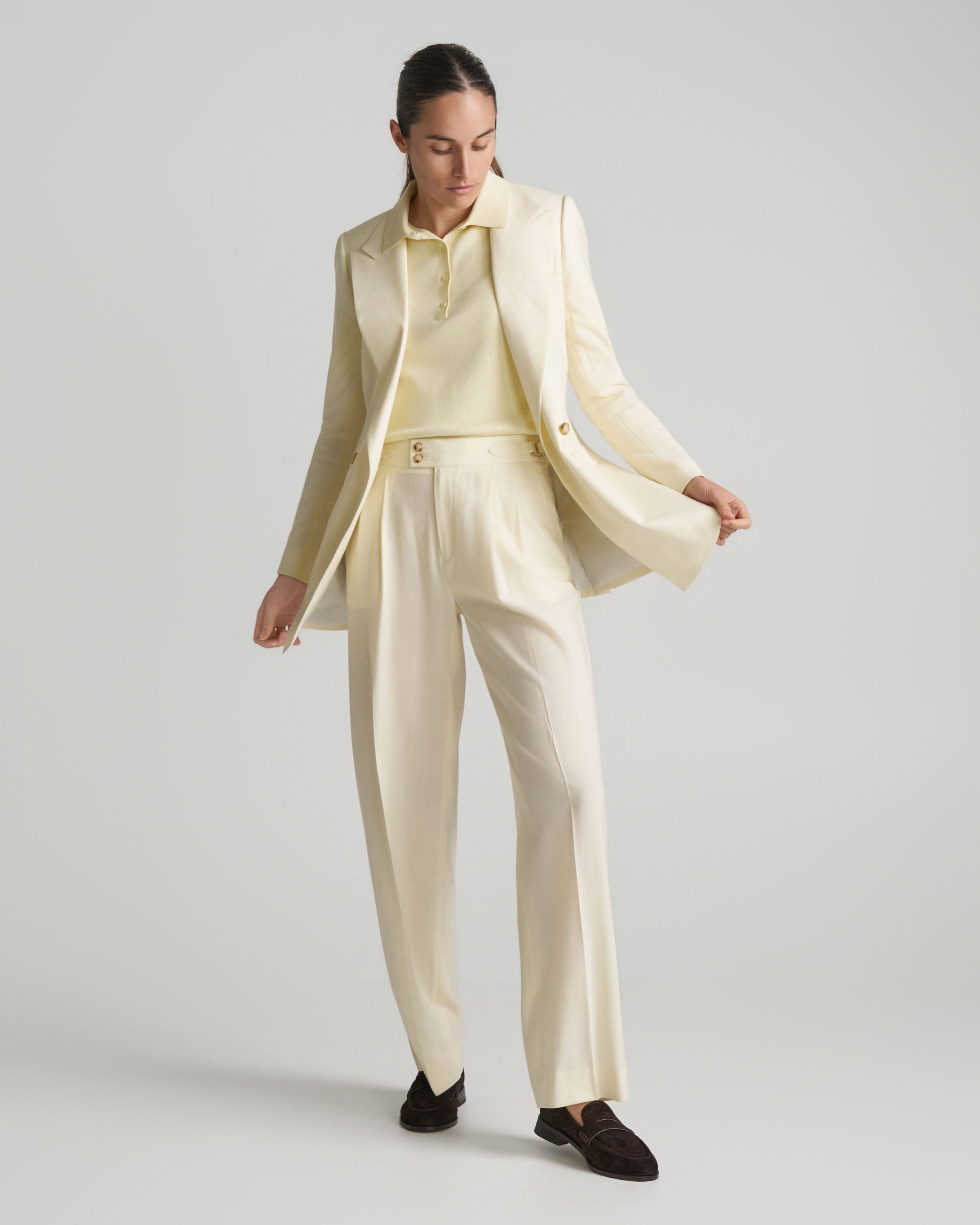 The jacket delivers sharp structure and is available as a double-breasted peak lapel blazer or a single-breasted blazer. It is designed to pair with matching tailored trousers, which feature front pleats and a relaxed, generous cut for added depth and a more traditional silhouette. Together, the blazer and trousers create a polished look that works across different occasions while exuding confidence and refinement.