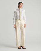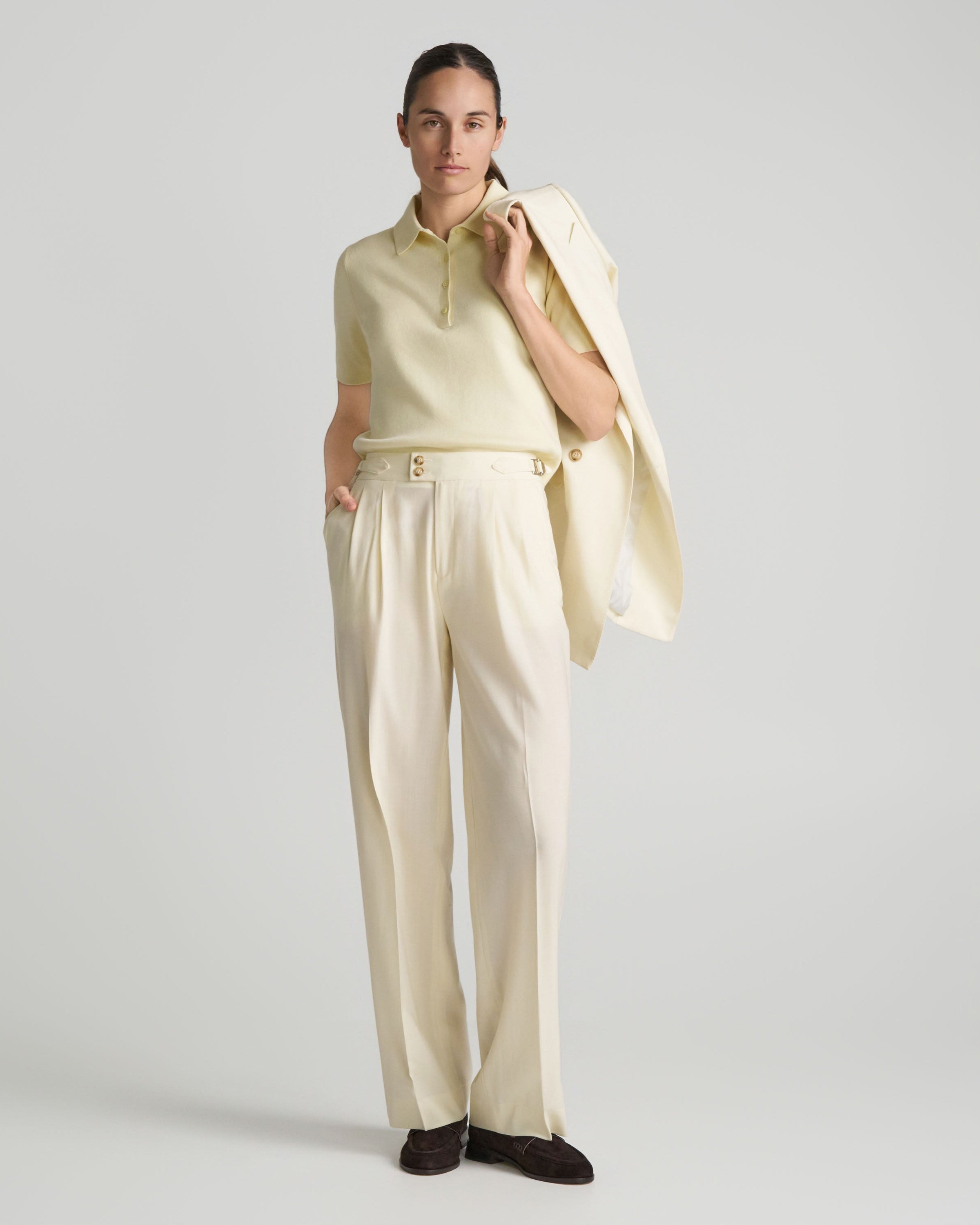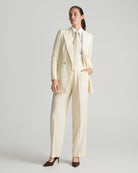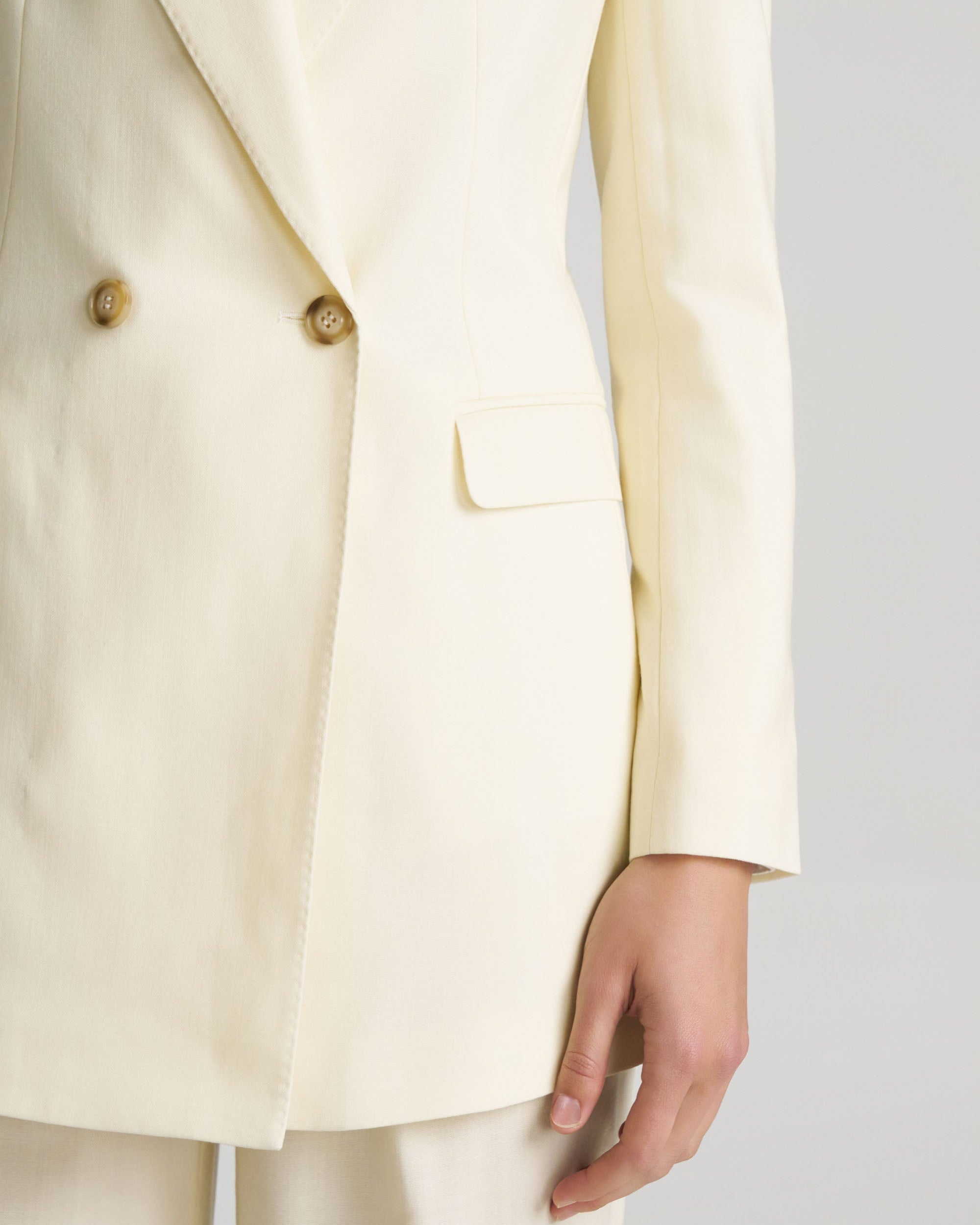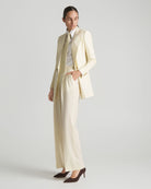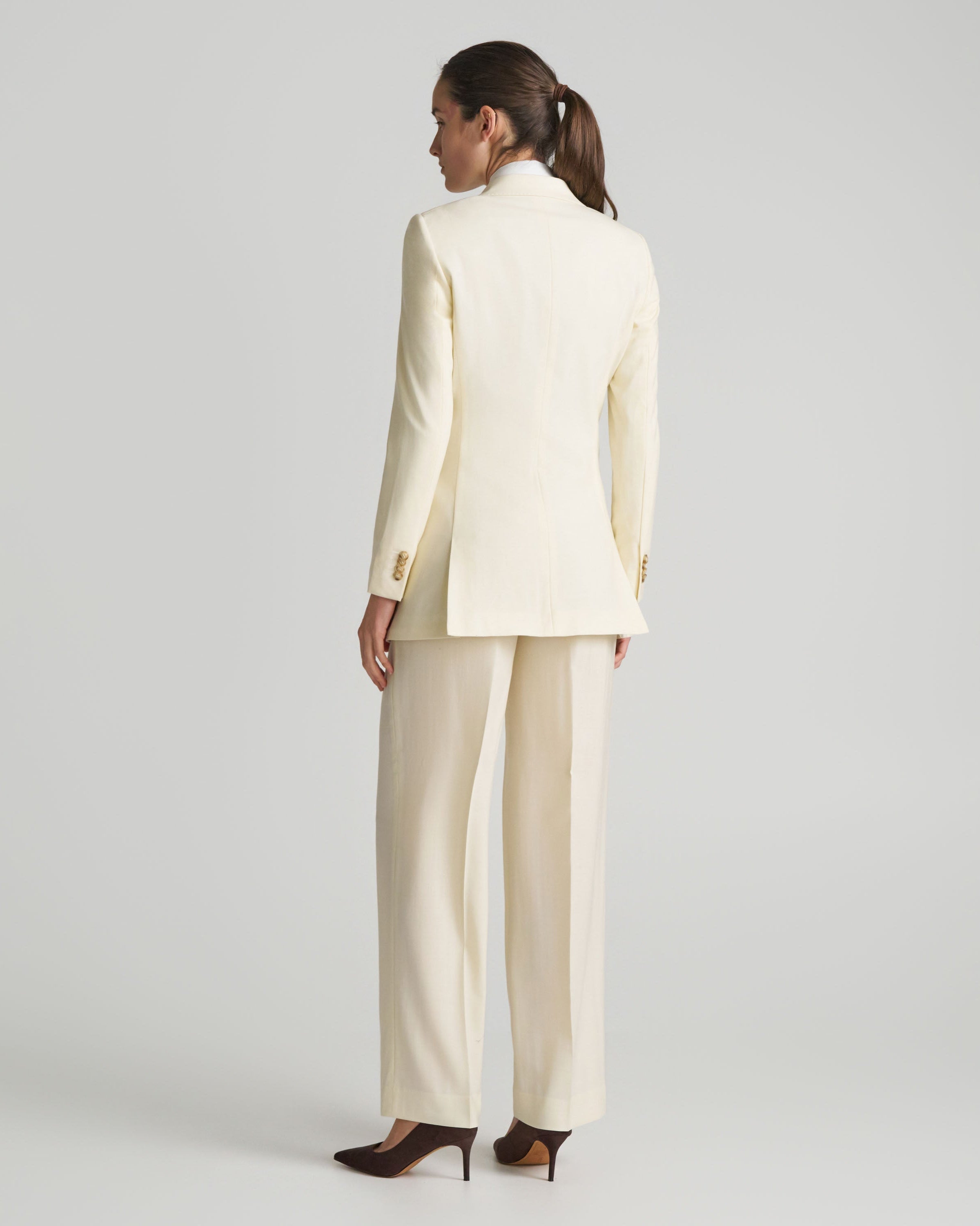 The jacket delivers sharp structure and is available as a double-breasted peak lapel blazer or a single-breasted blazer. It is designed to pair with matching tailored trousers, which feature front pleats and a relaxed, generous cut for added depth and a more traditional silhouette. Together, the blazer and trousers create a polished look that works across different occasions while exuding confidence and refinement.