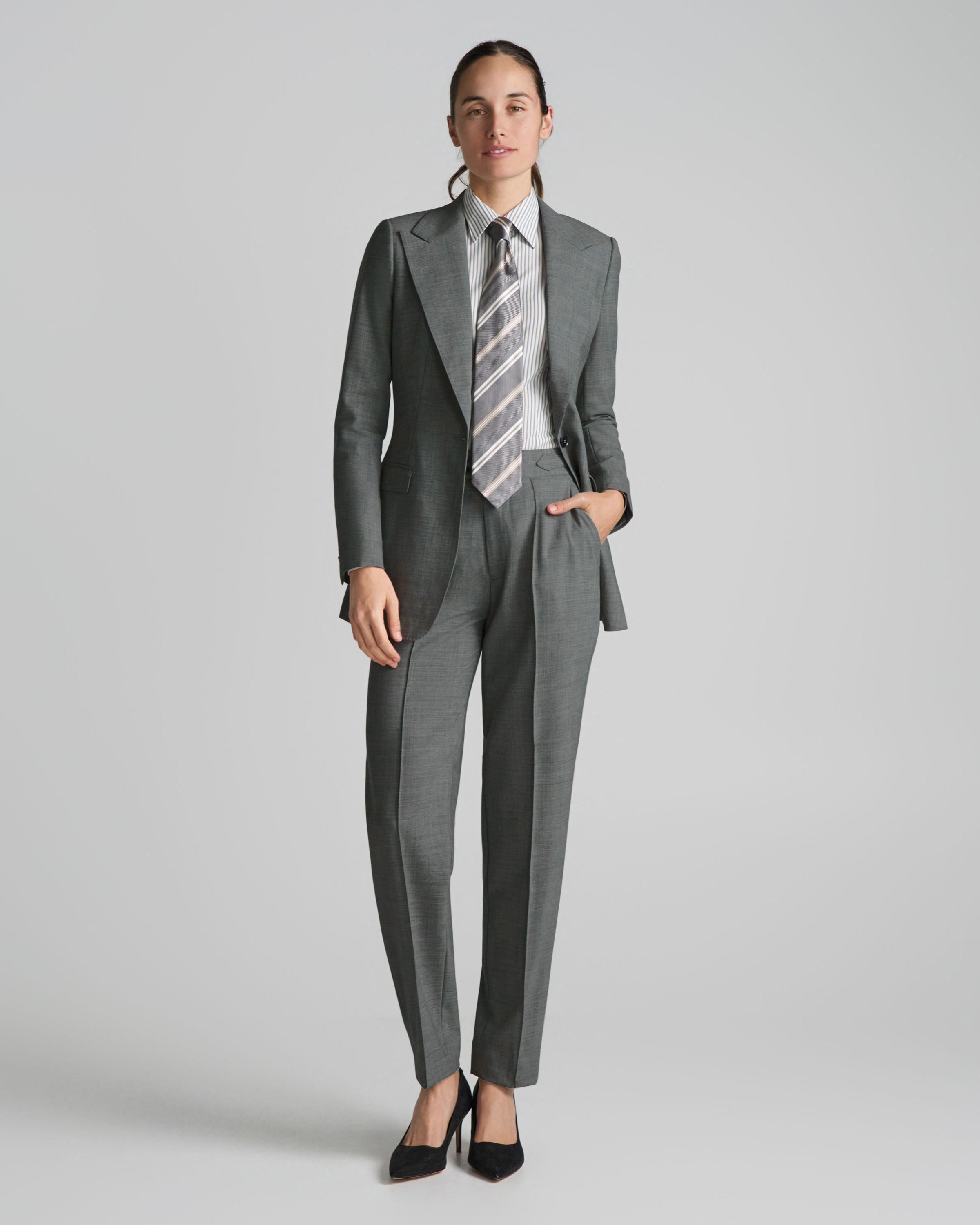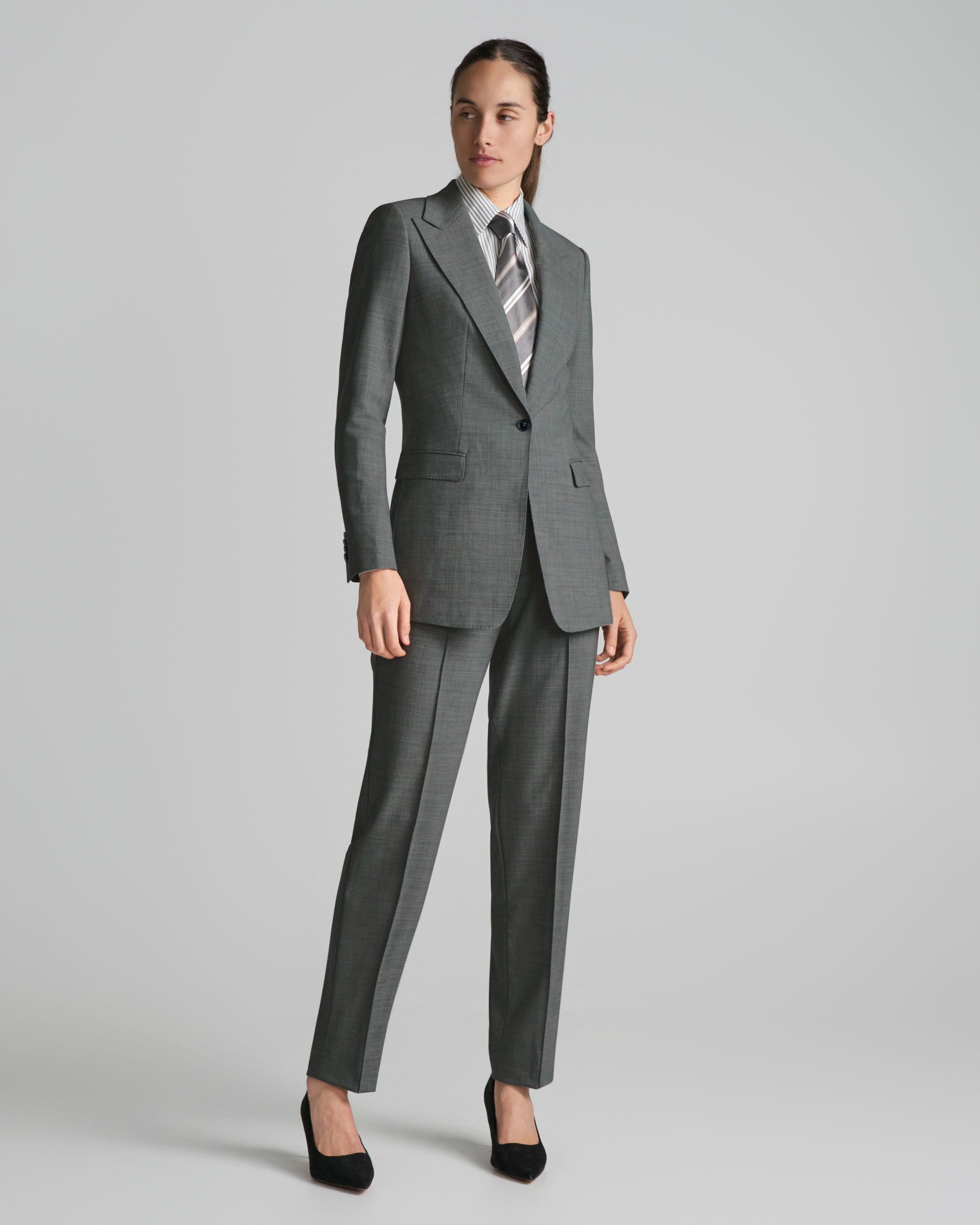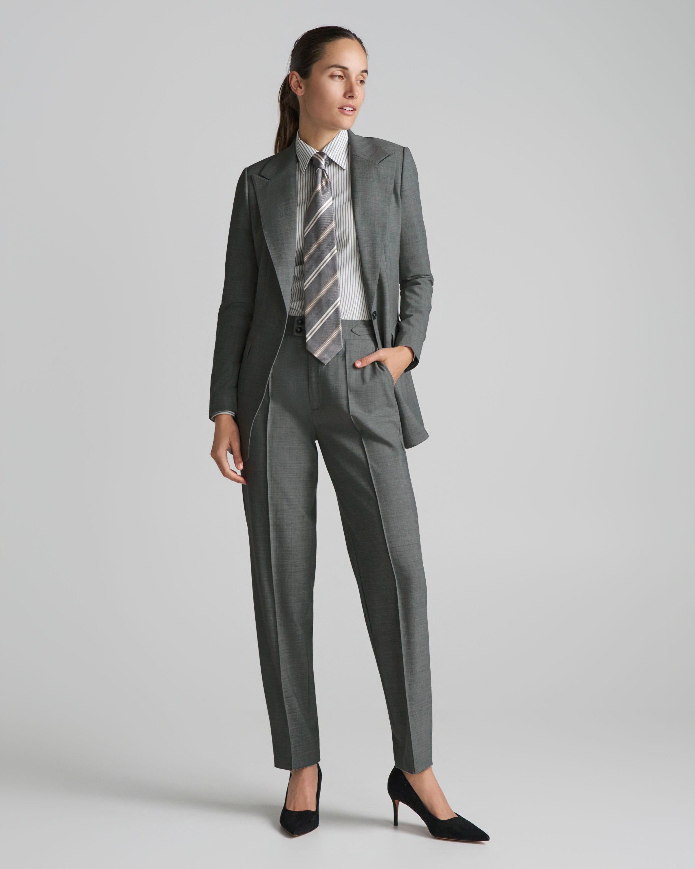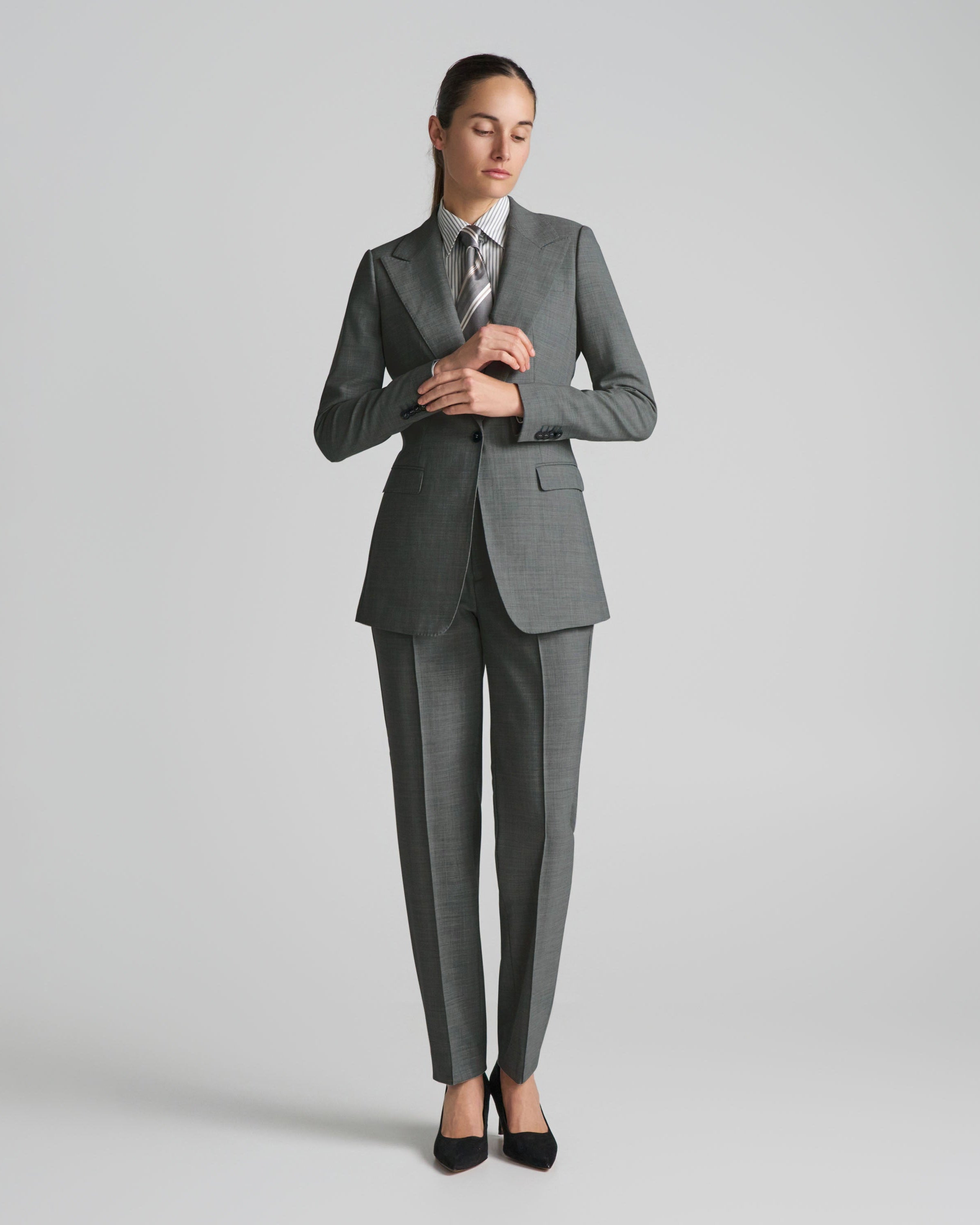 The jacket delivers sharp tailoring for a polished finish and is available as a double-breasted peak lapel blazer or a single-breasted blazer. It is designed to pair with matching tailored trousers, which are slightly tapered to create a smooth, elegant line. The result is a refined look that feels both contemporary and effortless, creating a polished appearance suitable for any occasion.